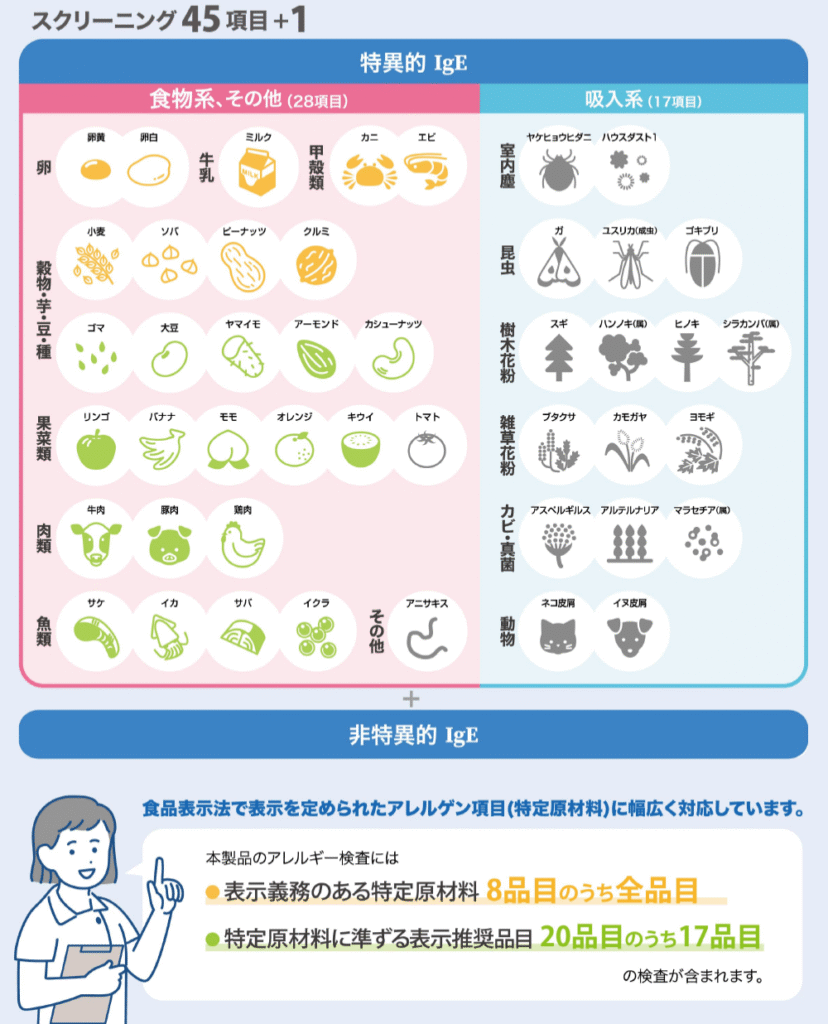 加工食品のアレルギー表示義務項目を100%カバー。45項目の特異的IgEと非特異的IgEの同時測定が可能です。